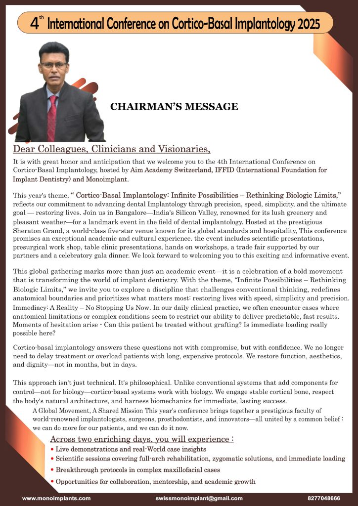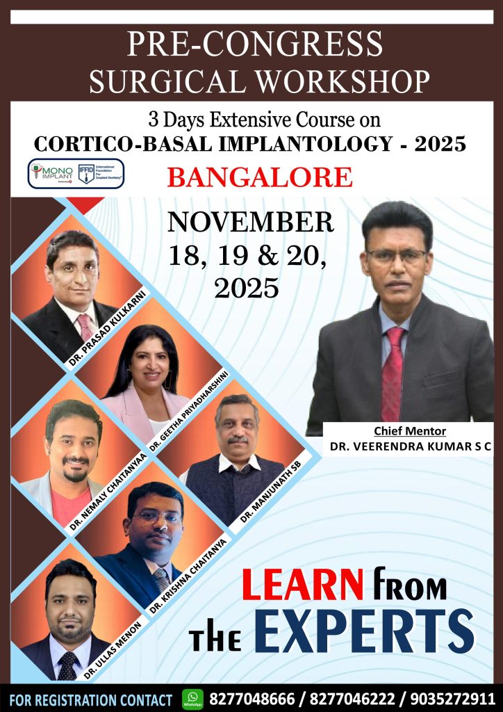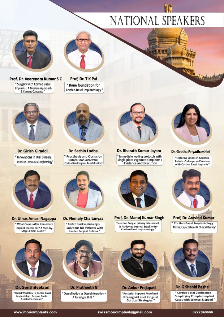 “The 4th International Conference on Cortico-Basal Implantology will bringĀ together leading clinicians, innovators, and pioneers from across the globe to explore the evolving science of immediate loading and graftless solutions.Ā will be Held in the vibrant city of Bengaluru, India, this two-day event showcases advanced surgical techniques, live demonstrations, hands-on workshops, and groundbreaking discussions on the future of fixed dental rehabilitation. These images capture the energy, exchange of ideas, and excellence in clinical practice that defined this landmark event. A celebration of precision, speed, simplicityāand lives restored through cortico-basal implantology.”