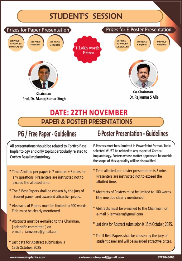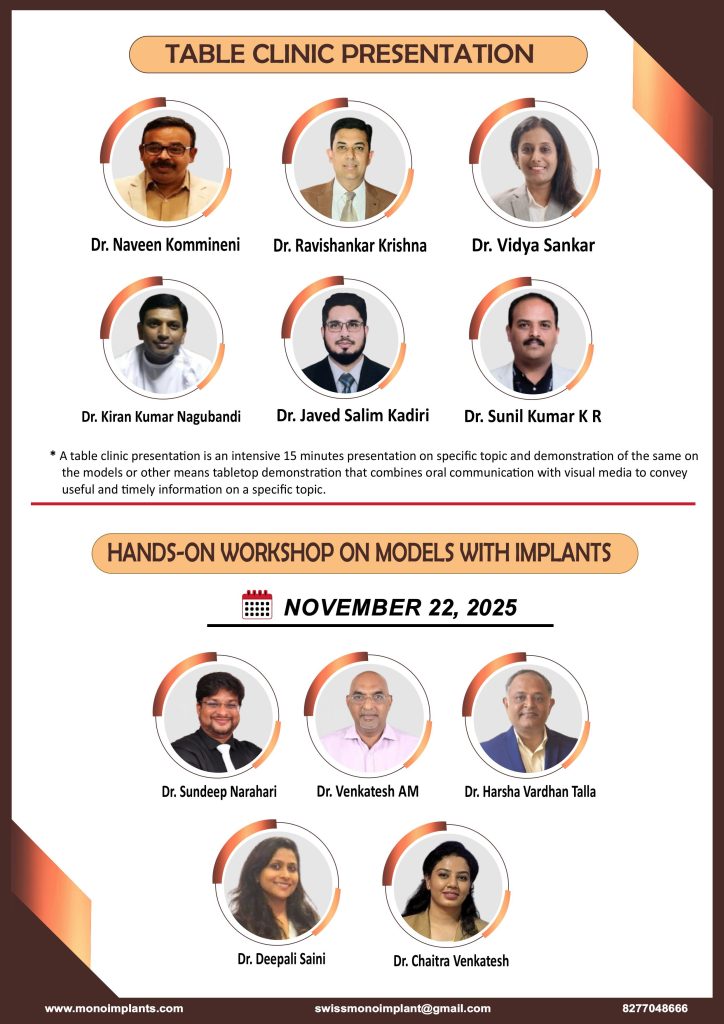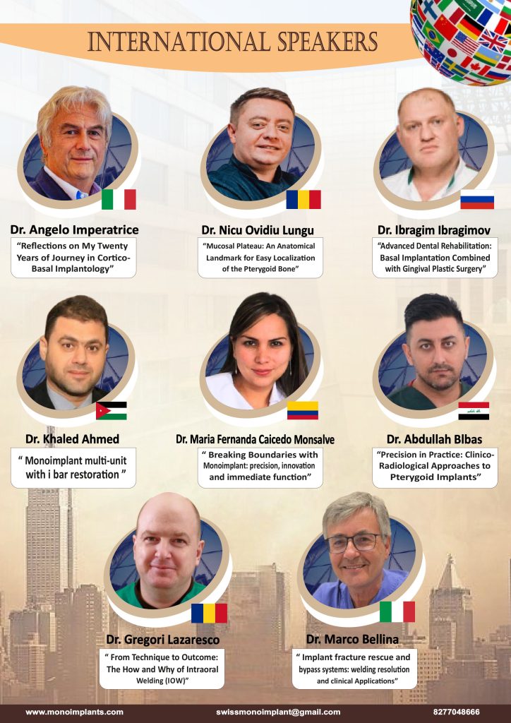 adapting to this new landscape Conference scientific committee formulated a unique scientific program that includes cutting edge techniques, non- surgical methods, pinhole surgical protocols, advanced immediate implants solutions etc., along with the highly clinically wrapped scientific program from renowned speakers like Dr. Lungu Ovidiu from Romania Dr. Ahmed Hindy from Iraq ,Dr. Dario Castro from Spain, Dr. Shmoylov Andrey from Russia Dr Nizar and Dr. Khaled Ahmed Harb From Jorden, Dr. Ilyes Hunor From Romanis our national speakers were from 33 different experts from different regions of India who presented latest trends in the immediate load dental implantology. Clinicians worldwide have witnessed compelling success stories, and long-term case presentations have substantiated that the techniques of basal implantology are the preferred method when immediate load concepts are necessary in the field of dental implantology. The Conference Endorsed Corticobasal Implantology Technique has achieved a remarkable level of maturity. This advancement is attributed to its